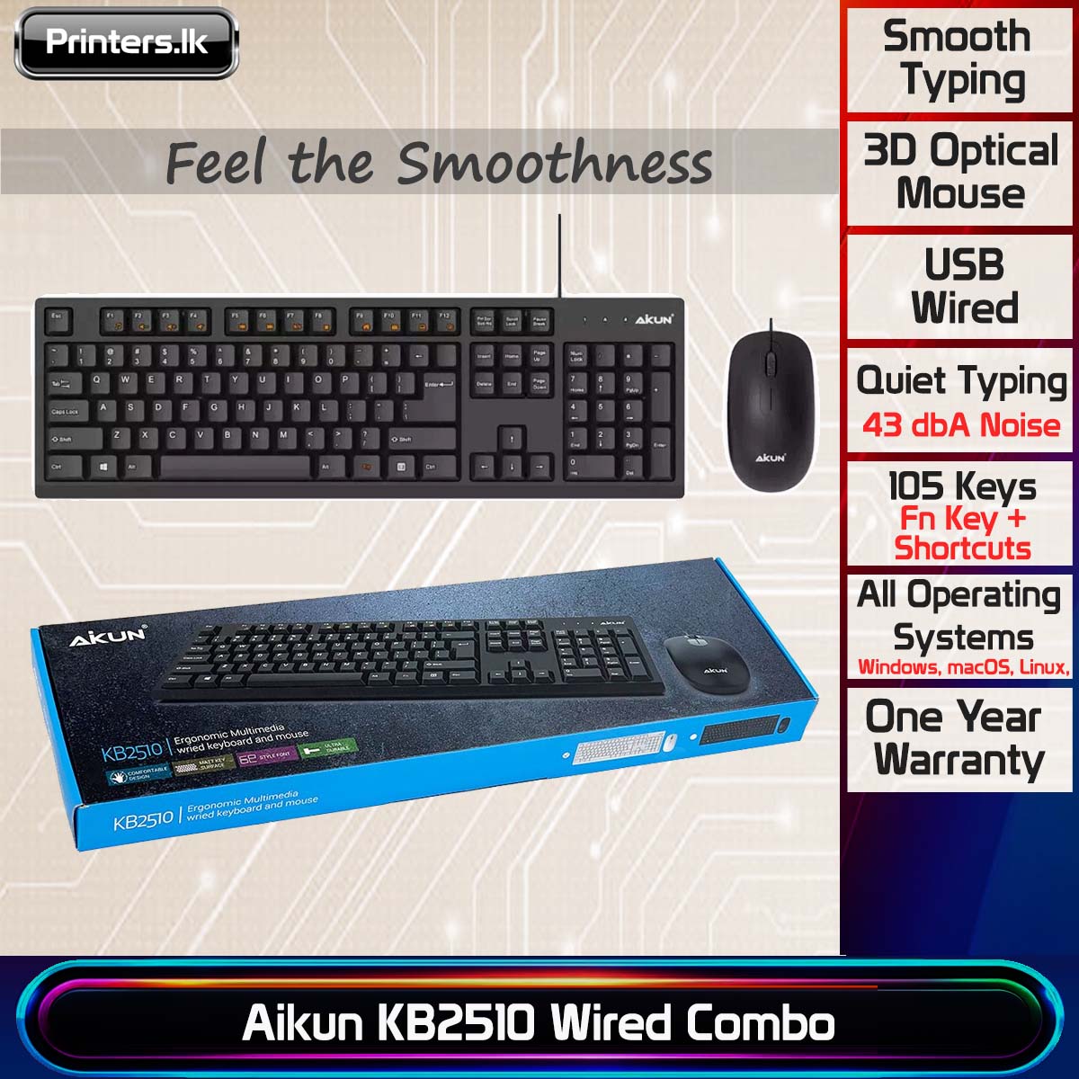 Aikun KB2510 Combo USB Wired Keyboard and Mouse stands out with its durable construction, responsive keys, and high-precision 3D optical mouse. It’s designed for long-term business use.